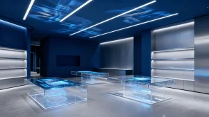 - 设计亮点:打造“AI未来实验室”场景,通过数字沙盘演示技术应用版图,搭配语音交互机器人讲解研发历程;