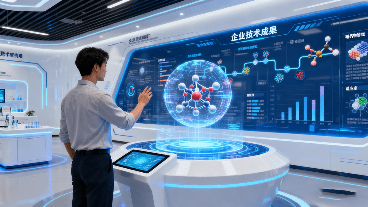 再接着,就是展厅的核心区域 —— 研发成果展示区。这个区域可太精彩了,通过好几个展示板块,把创元生物医药在技术研发方面的优势和成就全方位地呈现了出来。在技术竞争优势展示区,有个圆形展板,上面列出了公司的十大技术竞争优势,像创新药研发平台、高通量筛选技术等等,每个优势都配上简洁的图标和文字说明,就算是对生物医药不太了解的人,也能一下子明白公司的技术实力有多强。旁边的展板还详细介绍了公司的服务范围,从靶点验证到药物化学合成,把公司在生物医药研发产业链中的全面布局展示得清清楚楚。[此处可插入技术竞争优势展示区的图片]