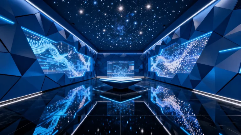 科技未来展厅设计:金属、玻璃、冷色调、动态光影